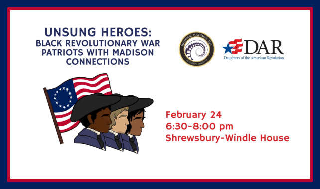 Join us on Tuesday, February 24, at 6:30 p.m. at the Shrewsbury-Windle House for a lecture focusing on the stories of Black Revolutionary War Patriots and their Madison connections. This program is a partnership between the John Paul Chapter of the Daughters of the American Revolution (DAR) and Historic Madison, Inc. (HMI) in celebration of the 250th anniversary of the United States and Black History Month. Tickets are free, but advanced registration is required, as seating is limited. Proceeds from this program will benefit preservation efforts for the site and the John Paul Chapter of DAR. Reservations are open now here: https://tickets.madtixevents.com/.../hmi.../tickets.